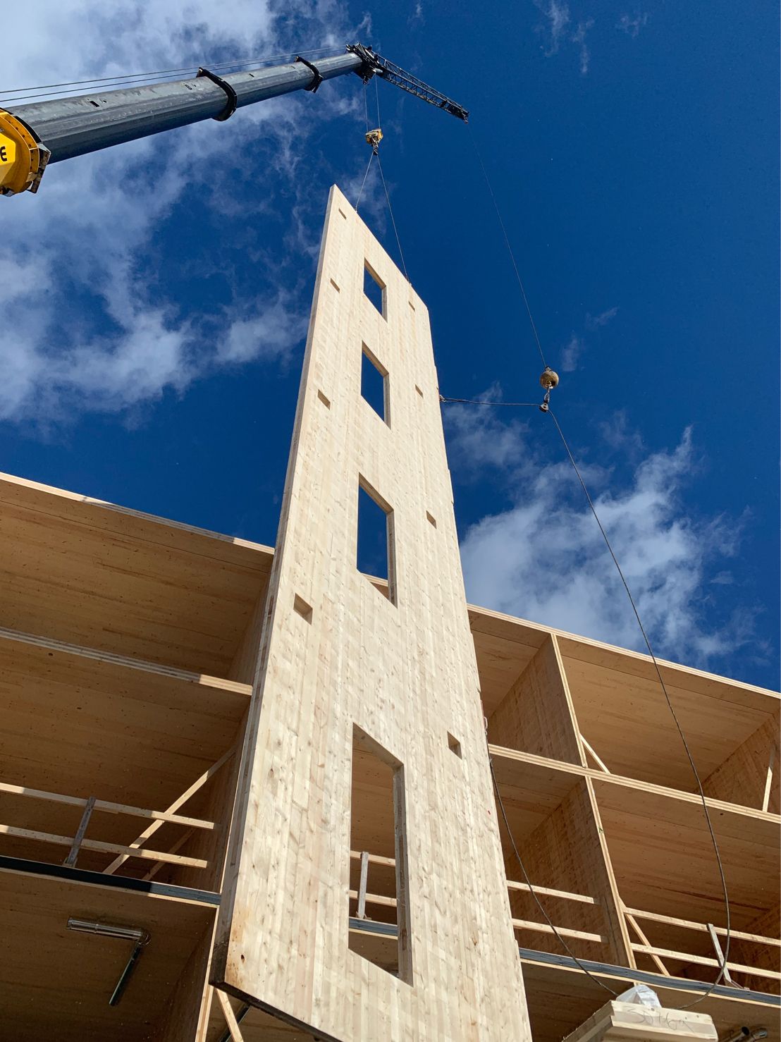 Built on City of Kitchener-donated property, the YW Block Line Road Supportive Housing complex is a 2,130-square-metre, 41-one bedroom unit, four-storey building built entirely with cross laminated timber (CLT), including the stair and elevator shafts. Some glulam beams and columns were used on the ground floor entrance area, with some Douglas fir support the CLT entrance canopy.