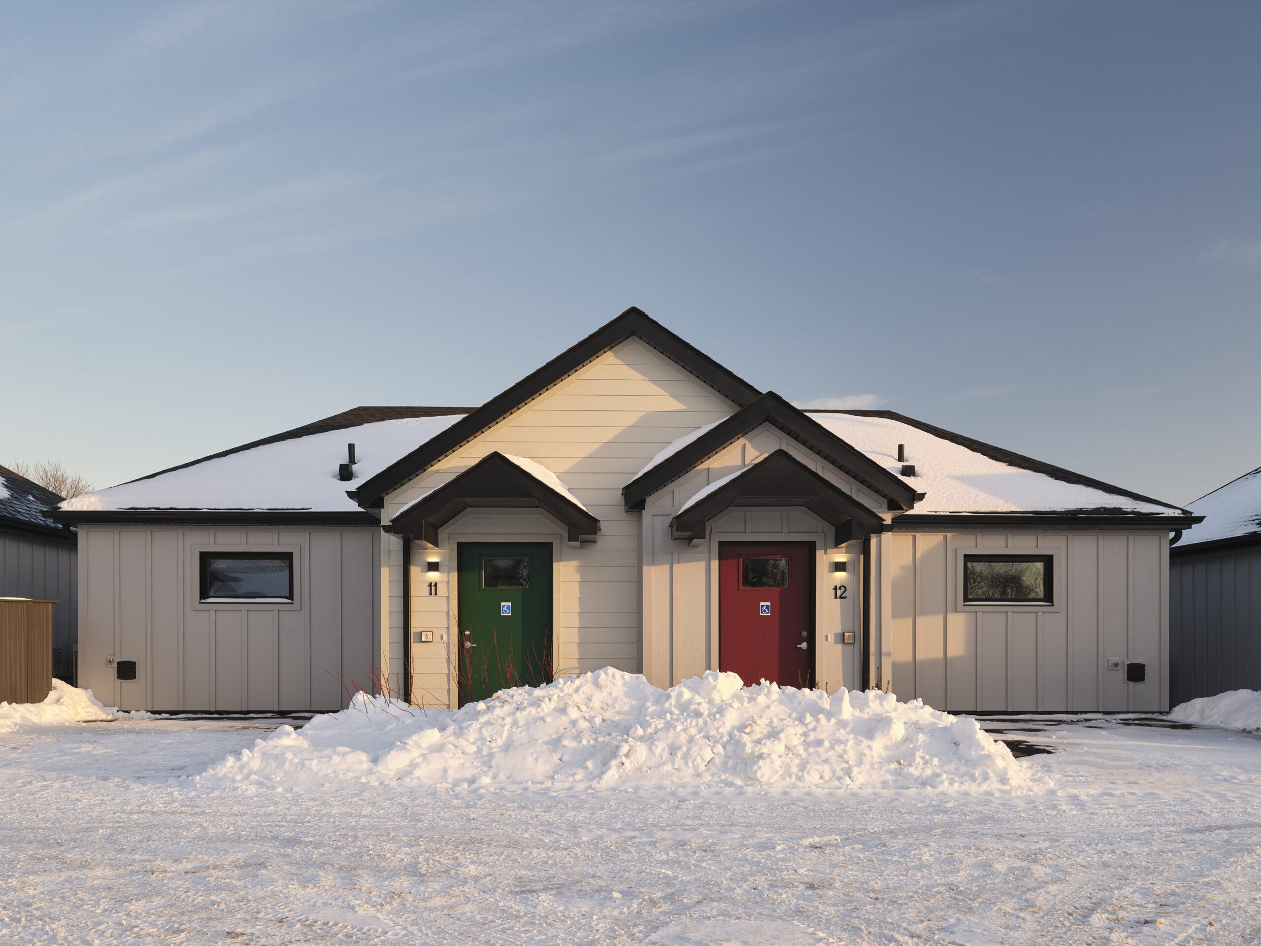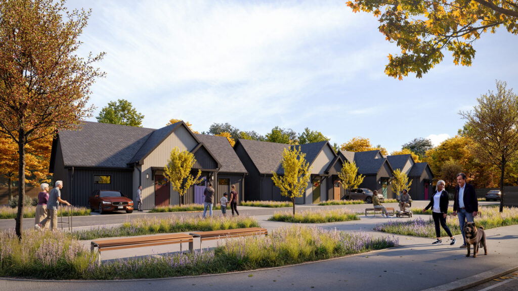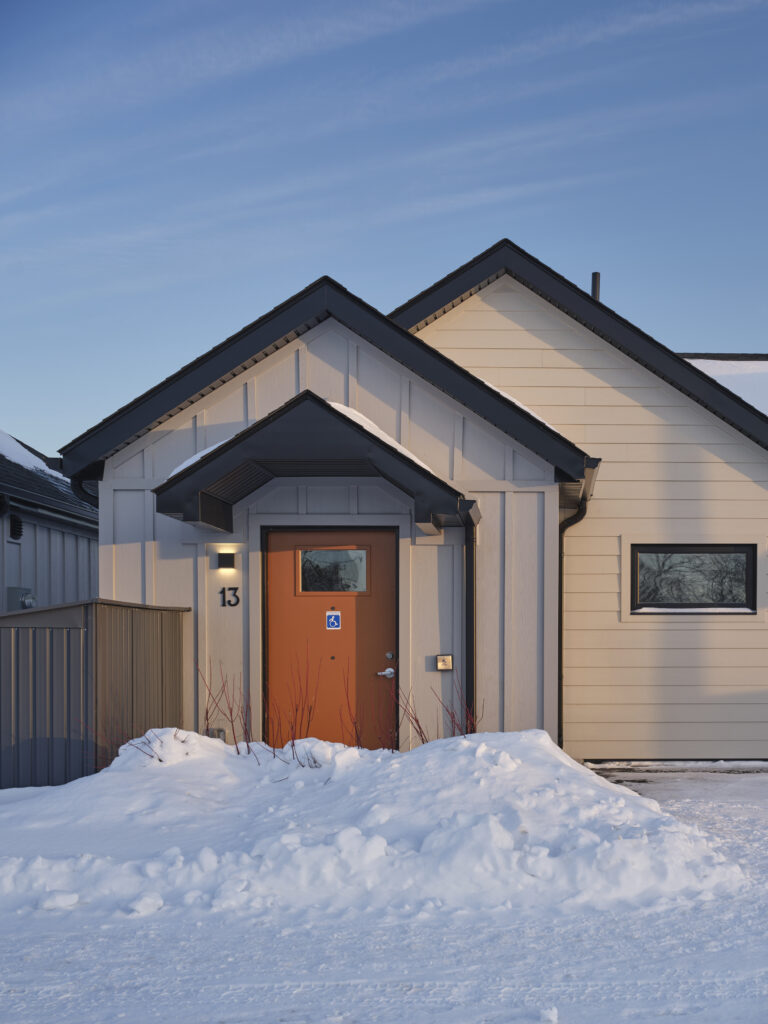 The project was designed as a small-scale, village-like seniors housing development composed of seven single-storey duplex buildings, delivering 14 fully barrier-free homes that support aging in place while maintaining independence and dignity. Rather than consolidating residents into a single institutional building, the development adopts a “missing middle” typology that reflects the scale and character of the surrounding neighbourhood.