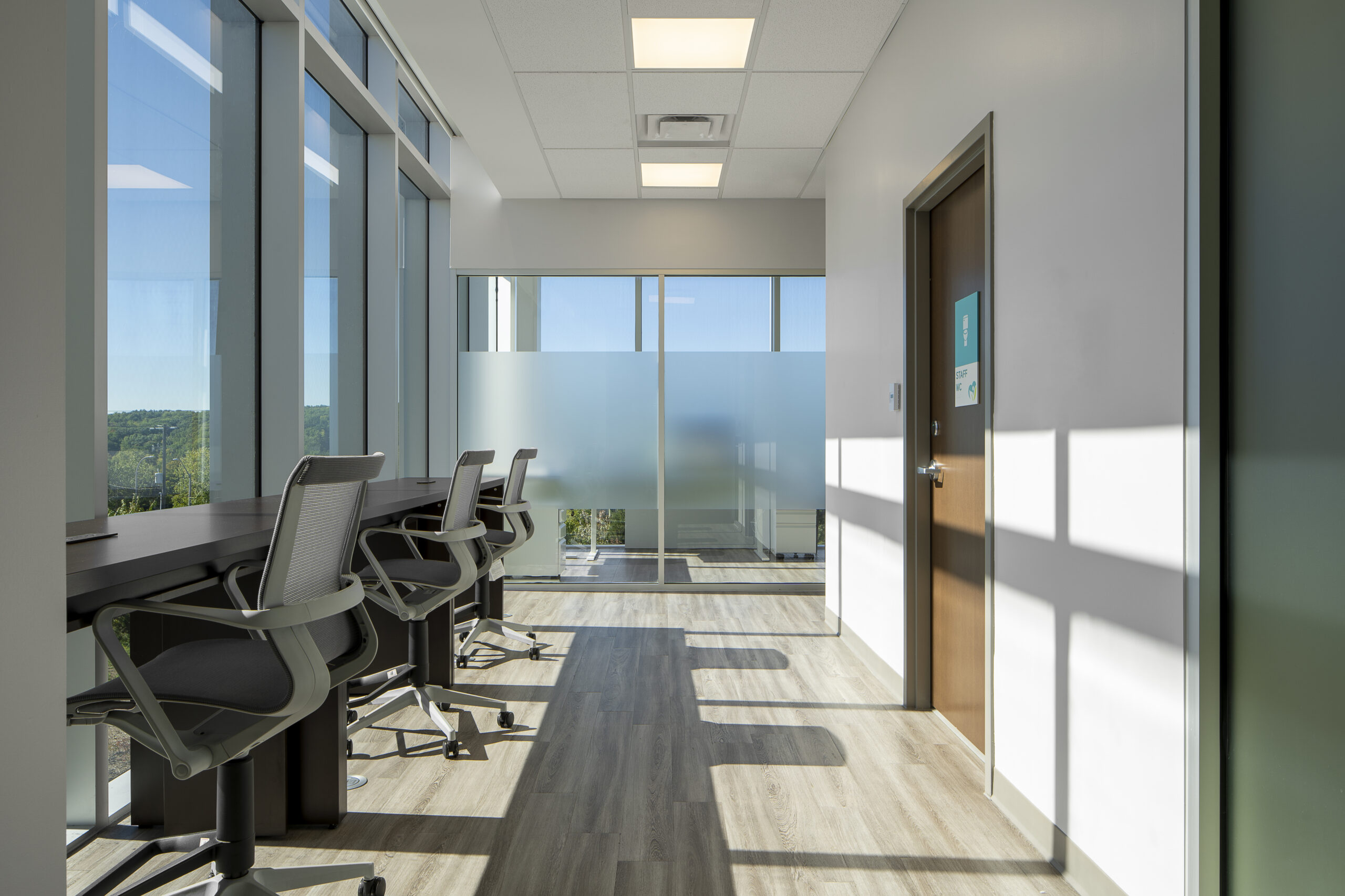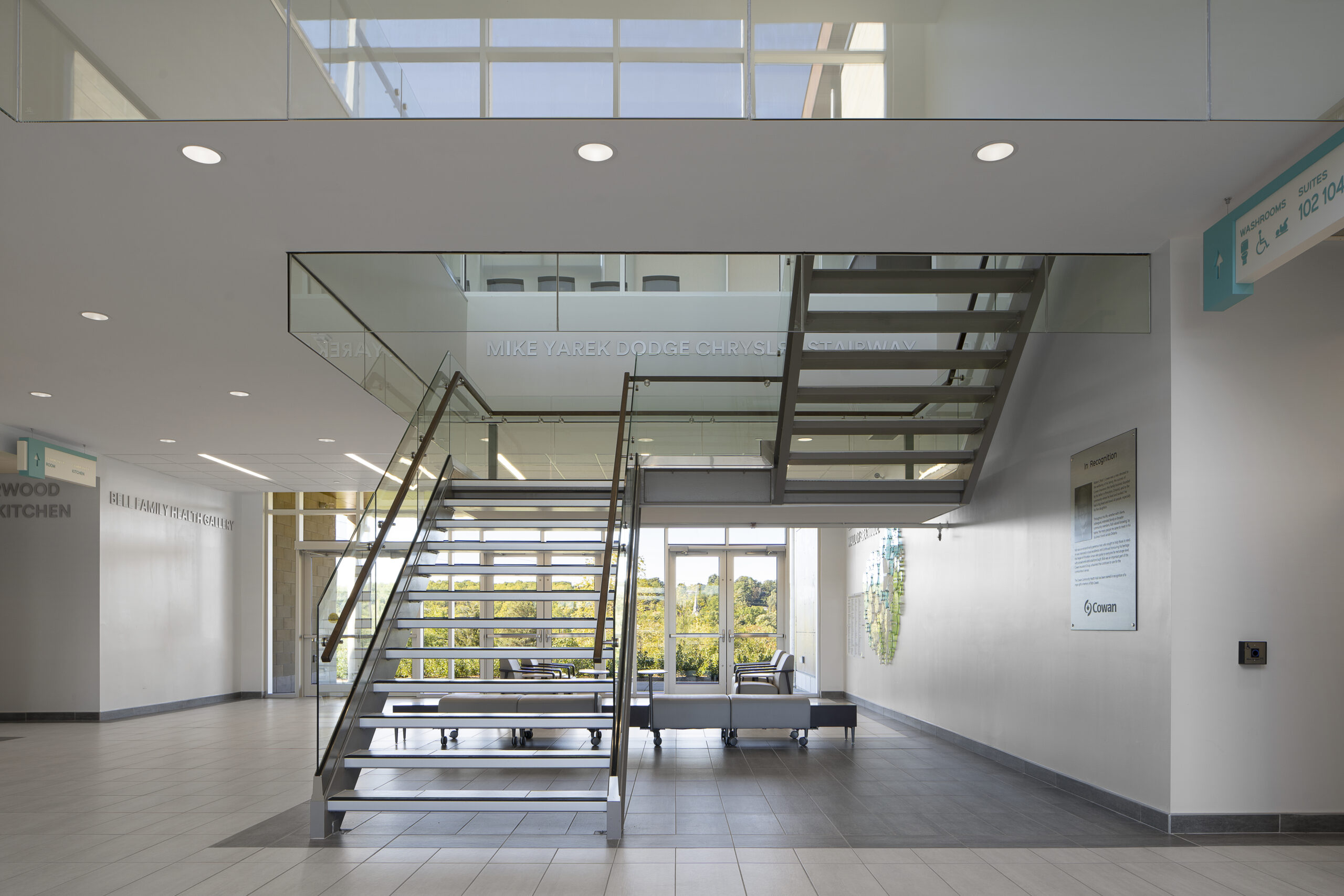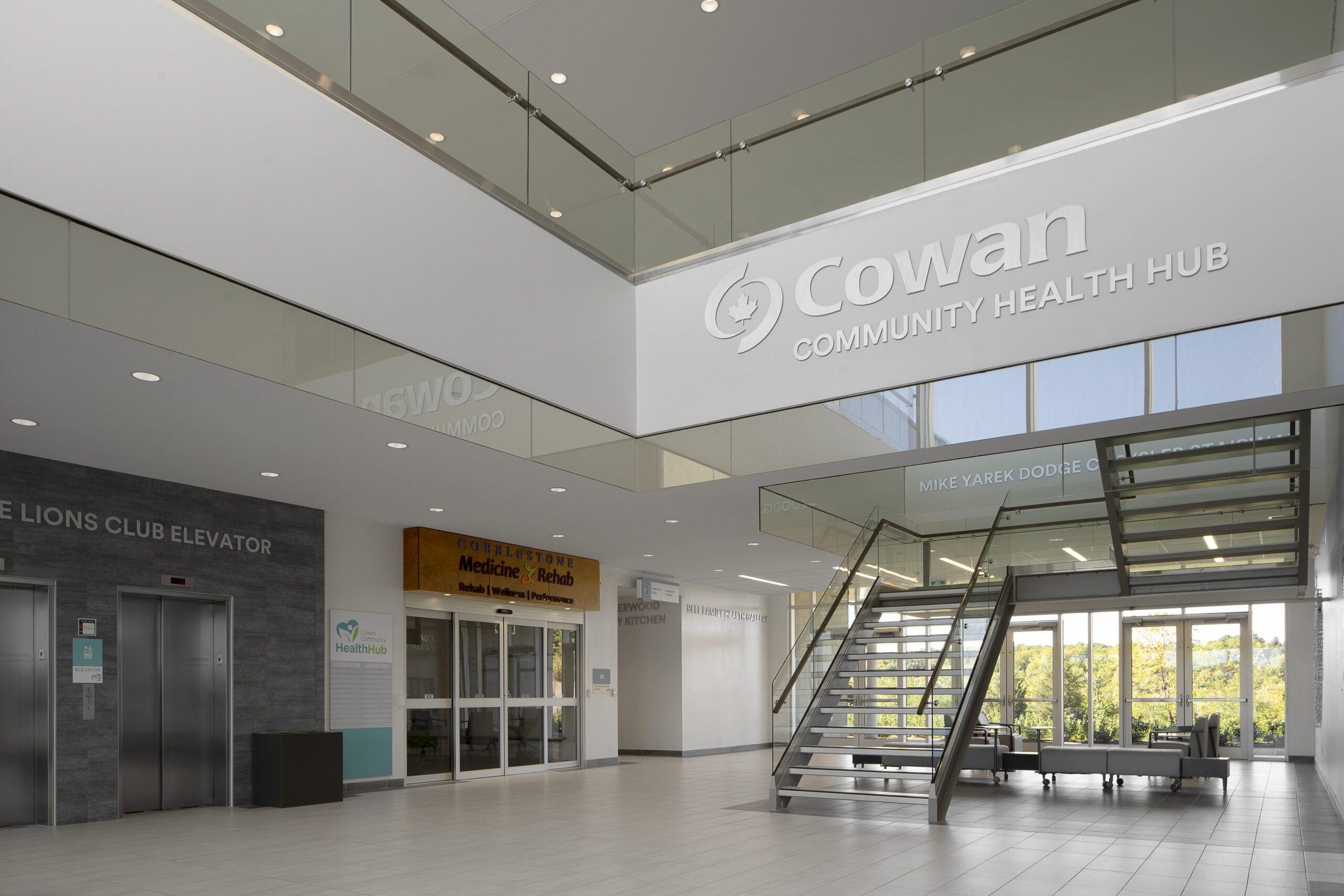 The two-storey, 42,000 square foot Cowan Community Health Hub prioritizes accessibility, functionality, and aesthetics. The building features a double-height central atrium that floods the space with natural light, creating an inviting and uplifting environment for patients, visitors, and staff. Communal spaces like the Community Room and Meeting Rooms were designed to enhance the sense of community and facilitate collaboration among healthcare professionals and service providers. The building’s structural steel framing and concrete floors allow for flexible interior space planning, while its exterior is clad in a mix of locally manufactured veneer masonry, composite wood panels, and glazing.