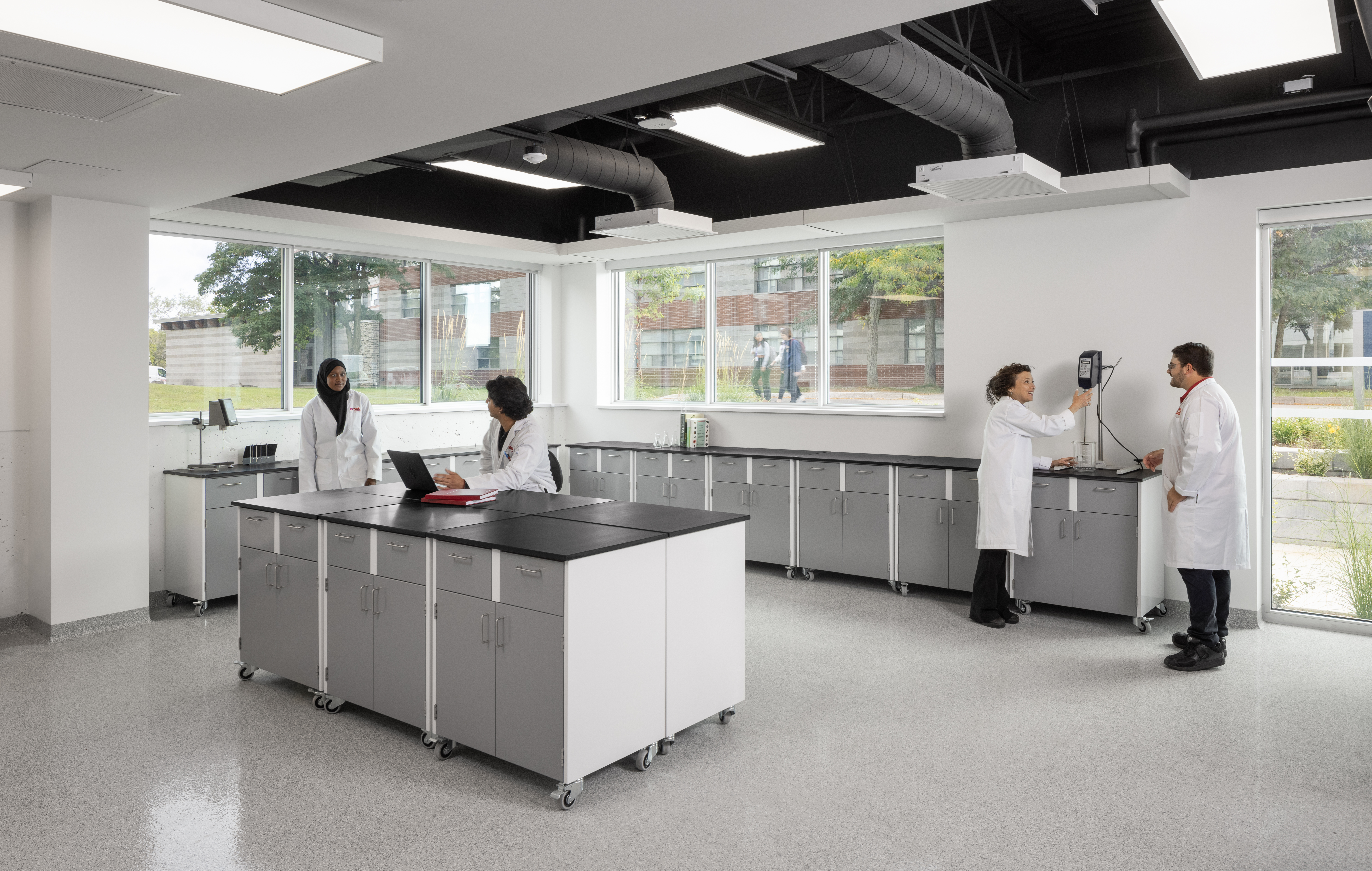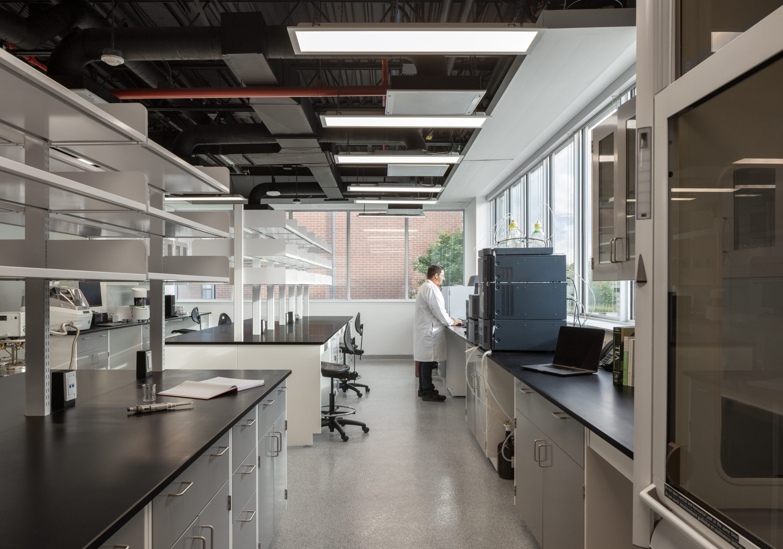 The modern two-storey addition to the existing Inniskillin Hall brings a wide range of equipment and laboratory space under one roof and combines it with areas for training and mobilization as well as hosting for community events. The light-filled labs are a welcoming space to work, connecting visually with a main pathway through the campus and creating a showcase of its science. An efficient new stand-alone air HVAC system connects with the University’s Central Utility Plant (CUP), working alongside a high-performance envelope that minimizes thermal bridges, limiting the use/depletion of energy inputs.