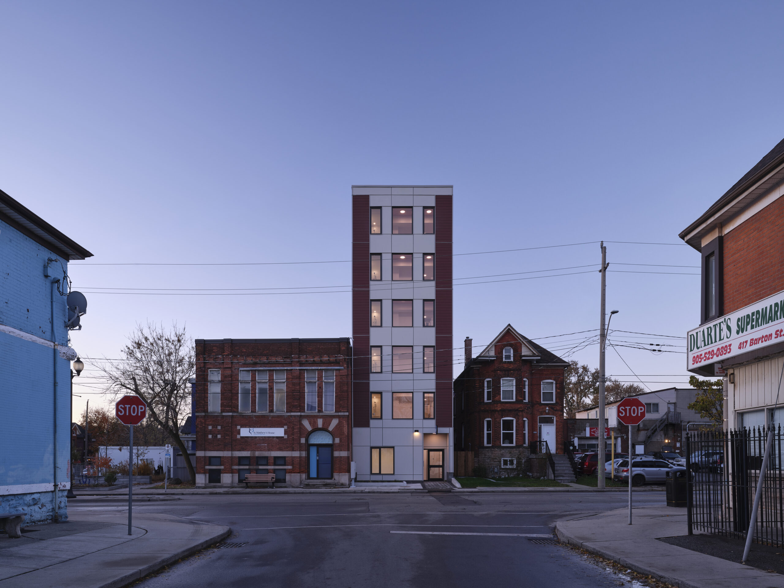 The slender six-storey design of a new deeply affordable housing building, squeezed into a tight lot on Barton Street East in Hamilton, distinguishes it from the squat, inner-city landscape.